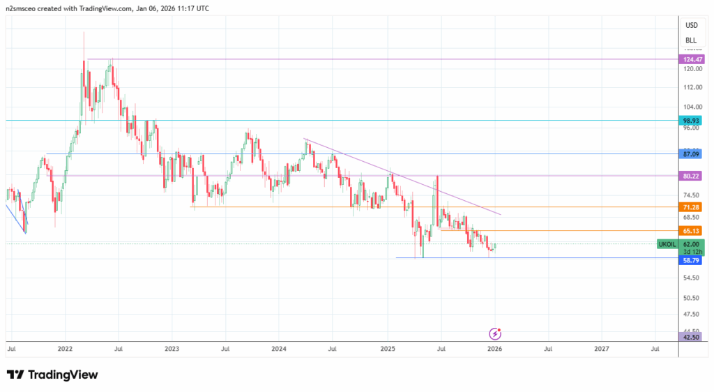 Brent crude oil price today continues to hover around $62 at the time of writing. The long-term chart below shows that the asset remains in a downtrend, which was brought on by declining demand from China amid the US tariffs. The market continues to struggle under conditions of robust supply and weak demand.