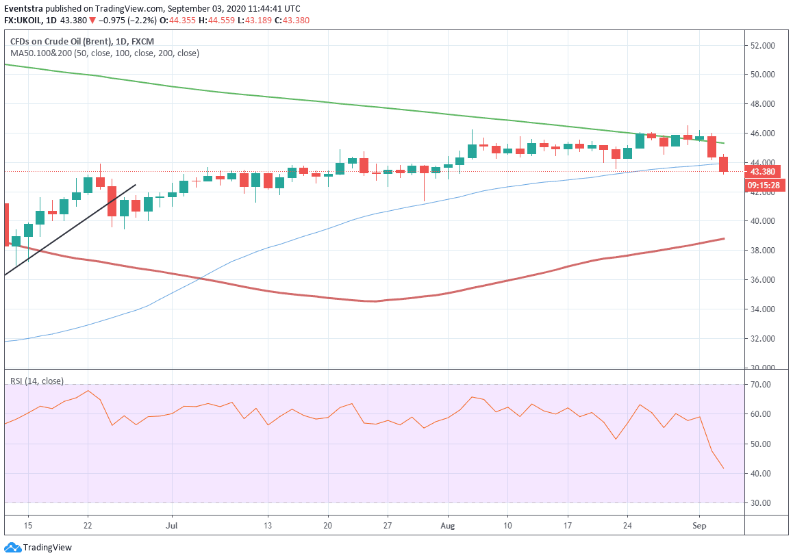 Brent Crude oil price has lost over 13% in the last eight trading days amid concerns that the rebound in oil demand has weakened as the data showed for the consumption of oil products in the U.S. has stalled in August. Meanwhile, the oil production is coming back after the OPEC+ oil production cuts and the recovery in the oil production in the Gulf of Mexico.