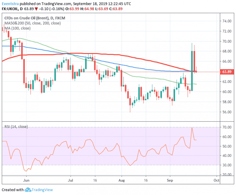 Brent Crude Oil price consolidates around the 100-day moving average as oil traders trying to estimate the time that needs to return at full capacity the Aramco facilities in Saudi Arabia after the drones attack.