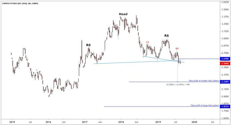 What could also weigh on copper prices is that the warehouse levels of copper at the London metal exchange on August 20 were at 329,600 ton. As seen in the chart below the level of inventories are around the same levels as in April 2018, when copper prices were trading about 26% higher than today.Source: Infomine.com.Technically, the December copper contract triggered a large head and shoulders pattern on July 22. The pattern was formed in the 2017 to 2019 period, while a smaller head and shoulders pattern was created in the last 12 months. We have denoted the head, and the left and right shoulders of the smaller pattern with an orange color. The minor pattern is suggesting that the price might be able to trade to 2.24 as long as the price trades below last week’s high of 2.6490.