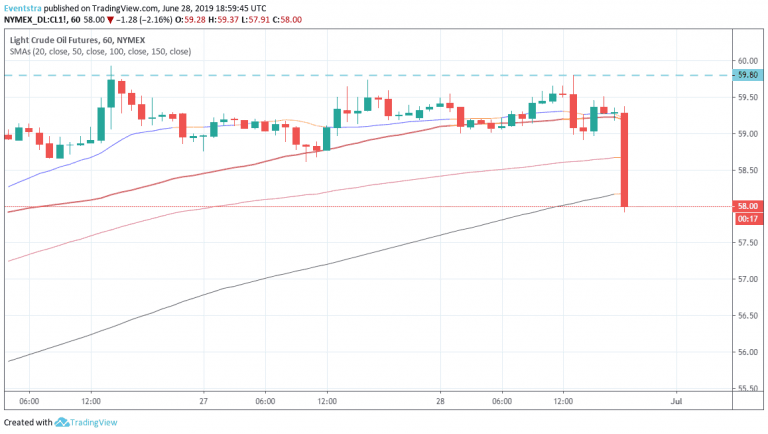 The Baker Hughes oil rigs in the USA rise for second straight week to 793 from 789 the previous week, analyst forecasts was for 785 rigs. The price of crude didn’t react to the news but as we approach the closing bell the price has moved to daily low at 58.28 down 1.65 percent for the day.