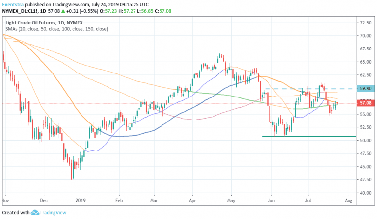Crude oil is trading 0.58 percent higher at $57.15 making the daily high at 57.27 fighting with the resistance at 59.15 the 50 day moving average. If the price breaks convincingly above the 50 day moving average the way to 57.94 the 20 day moving average will be open. On the downside crude oil immediate support stands at 56.75 the 150 day moving average while more bids will emerge at 55.12 the low from July 19th. The technical picture is neutral for black gold even the short term momentum has turned positive the last three trading sessions.