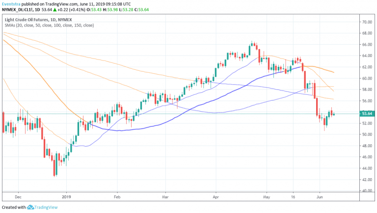 Crude oil trades lower today giving up about one dollar to 53,57 as the price retreats for recent high. The recent positive developments in the USA – Mexico conflict boosted a relief rally to oil benchmarks around the globe. The outlook for the crude oil market has darkened as IEA predicted a significant supply deficit in the 2Q of 2019 even as it acknowledged some cracks in demand. But since then things have seemingly taken a turn for the worse, with crude oil recording its worst month since the financial crisis. The previous week API report, showed that crude oil stocks in the USA grew by 3.5 million barrels in the week ending May 31, the EIA announced that commercial crude oil inventories rose by 6.8 million barrels in the same period compared to economist’s’ estimate for a draw of 0.8 million barrels. The Baker Hughes Energy Services showed that the total number of active oil rigs dropped to 789 from 800 last week and helped crude oil preserve its daily gains.