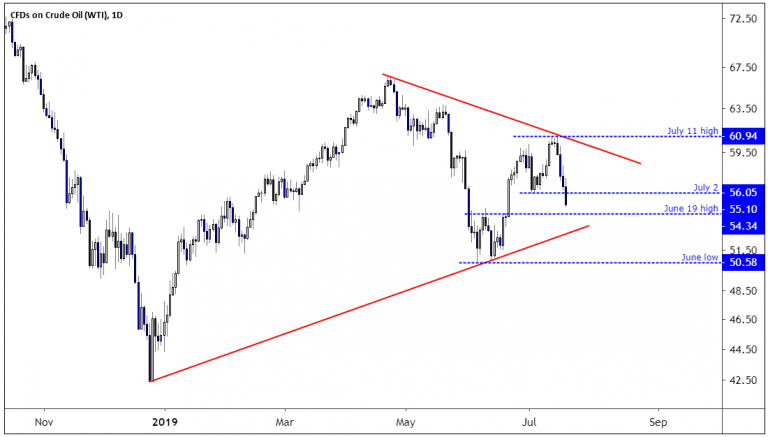 Yesterday, crude oil prices slid below their July 2 low of 56.05, and this opened up the door for a retest of the June 19 high of 54.34. The zone around the 54.34 limited gains in crude oil prices from June 3 to June 19 and is, therefore, a potential support level, and likewise take profit level. Below the 54.34 level, the next support level is the June low of 50.61 dollars per barrel.