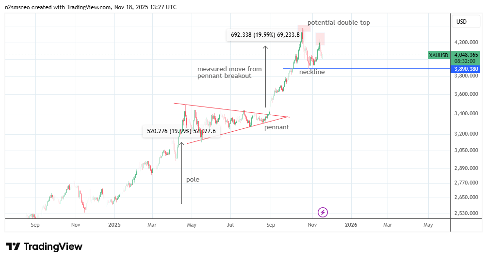 Technical picture: gold prices have hit the bullish pennant’s measured move price projections. The latest move looks overextended, and only new highs above the current all-time high at $4381 will sustain the uptrend.