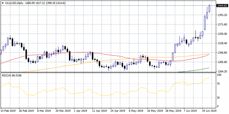 Gold holds the gains from the recent rally above 1,400. USD weakness and an escalation in USA – Iran tensions around the Hormuz Straits boosts gold prices. Short covering on Friday also helped gold to reach 1,411 a level that we haven’t seen since 2013. FED dovish minutes opened the door for more cuts before the end of the year.