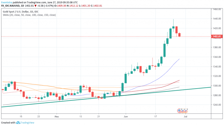 Gold holds the gains from the recent rally above 1,400 but is trading below the recent high. USD weakness and an escalation in USA – Iran tensions around the Hormuz Straits boosts gold prices. Short covering early this week helped gold to reach 1,439 a level that we haven’t seen since 2013. FED dovish minutes opened the door for more cuts before the end of the year and sparked a rally in dollar denominated assets.