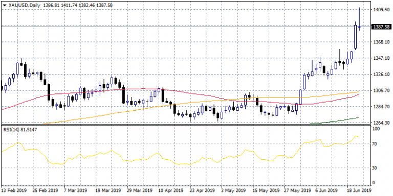 Gold continues the impressive rally making fresh five year high at 1,411. USD weakness and an escalation in USA – Iran tensions around the Hormuz Straits boosts gold. Short covering also helped for the gold to reach 1,411 a level that we haven’t seen since 2013. FED dovish minutes opened the door for more cuts before the end of the year.