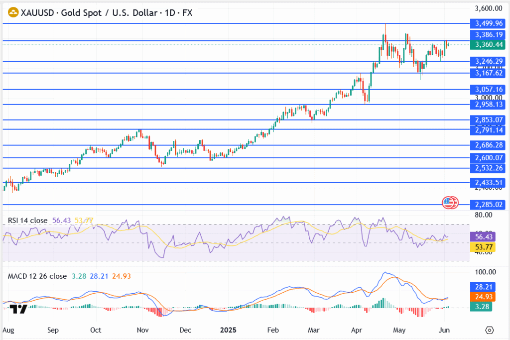 Gold (XAU/USD) is edging toward the $3,386 resistance mark on Wednesday, climbing nearly 0.6% as traders hunker down ahead of a data-heavy week. After a sluggish start to June, the metal is regaining momentum, driven by a softening dollar and rising caution around U.S. macro signals.