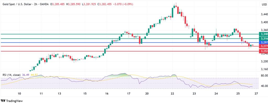 Gold price pivots at $3,297 and the momentum signals control by the sellers. It will likely find the first support at $3,277. An extended downward momentum will break below that level and could take the lower to test $3,252.