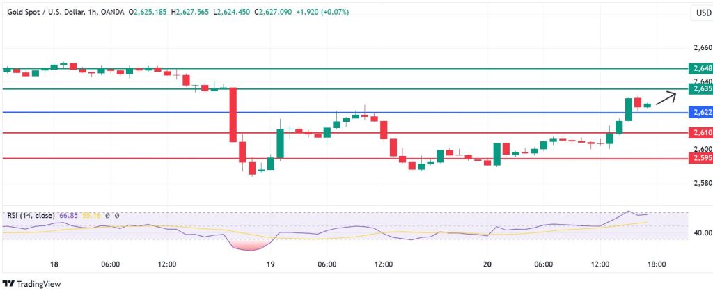 Gold price pivots at $2,622 and the RSI indicator signals that the upside will prevail if XAUUSD action stays above that level. The momentum will likely envounter initial resistance at $2,635. However, the metal could break above that level and test $2,648 if the buyers extend their control.