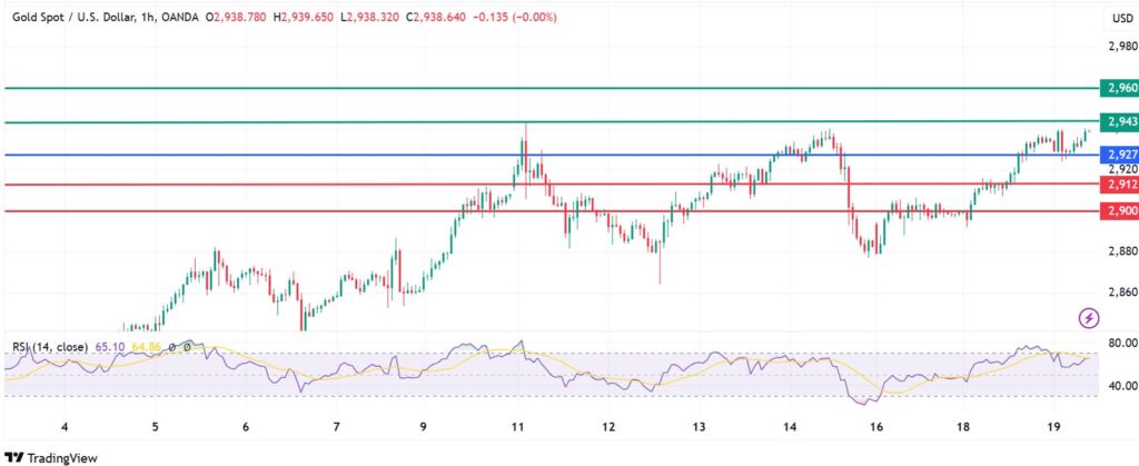 On the chart below, gold price pivots at $2,927 and the upside will prevail if action stays above that level. The first resistance will likely be at $2,943, but a stronger momentum will break above that level and potentially test $2,960.