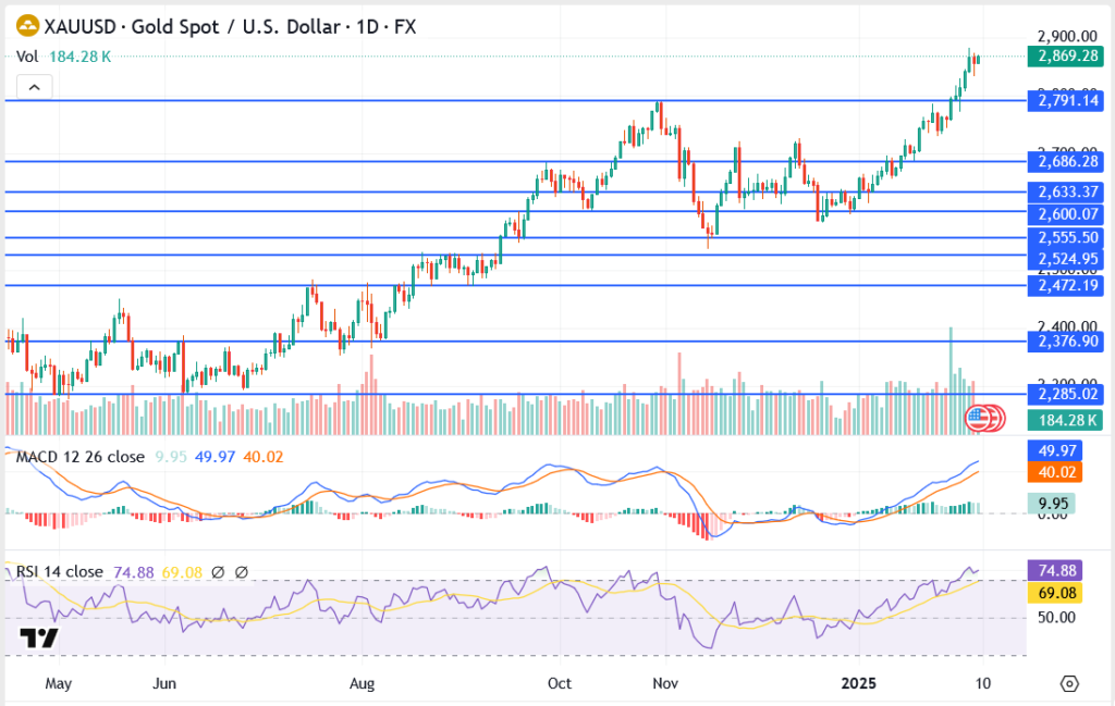 - RSI: Currently at 74.88, indicating that gold is approaching overbought territory. A pullback could be expected if buyers take profits.