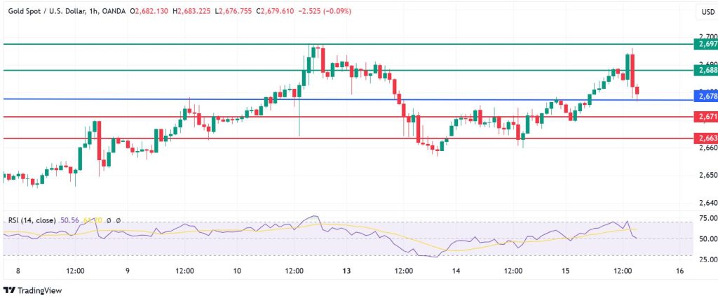 Gold price pivots at $2,678 and the momentum favours the continuation of the upside. The first barrier is likely to be at $2,688, beyond which the momentum could push the price higher to $2,697.