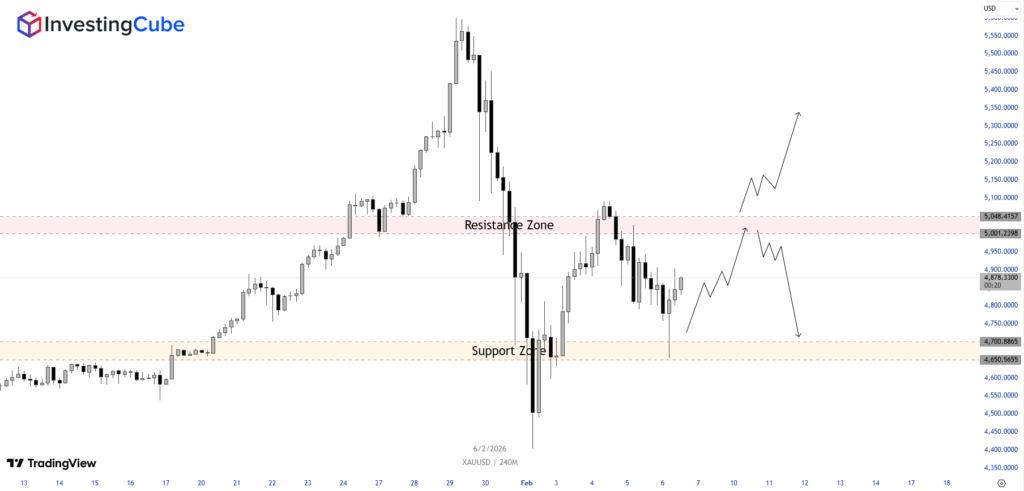 As of February 6, 2026, spot gold is trading within a wide range fluctuating around the mid-$4,700, and just below $5,000 per ounce. Multiple attempts to sustain prices above the $5,000-$5,100 zone have been met with rejection selling, as traders have been quick to take profits at elevated levels. This does not signal that bears are in control, but rather reflects strong supply emerging near recent highs.