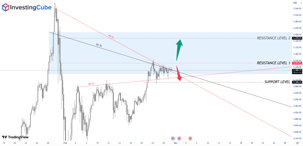 Support Level (Red H4 TL) On the other hand, a series of higher lows is being formed as we are supported by the H4 Trendline (Red). This represents the short-term momentum. So long as gold holds above this diagonal support, the “ by the dip” mindset is still the prevailing trade. However a failure, there to drive the focus right onto support level $5108 (black dashed line). A drop below this level (marked by the red arrow) would likely activate a cascade off stop loss orders and lead to a deeper correction pull back towards $5000 psychological support.