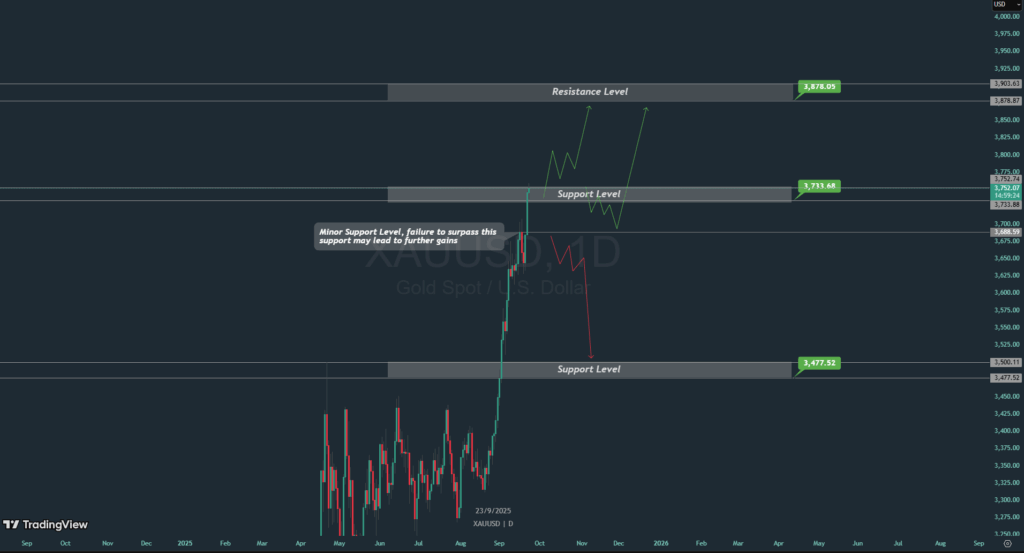 With momentum still firm, traders are no watching whether gold can push through $3800, $3,900 and the key $4.000 psychological resistance barriers.