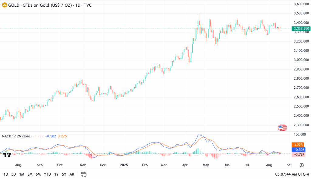 Gold spent Tuesday morning hovering near $3,335-$3,345 after a stop-start Monday, with buyers defending the $3,300 handle while momentum faded under $3,400. The tape looks like a truce. US yields are firm, the dollar has a mild bid, and safe-haven flows are softer as headline risk cools. At the same time, no one wants to dump metal ahead of fresh Fed clues and late-month event risk. ETF flows have slowed, not collapsed, and central bank demand is still a steady undercurrent. Net result is a tight range near the upper third of this year’s channel, a market waiting for a reason to move.