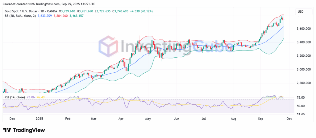 Gold price has its daily RSI at 73 and trades just below the upper Bollinger Band on the daily chart, underlining bullish control. Source: TradingView