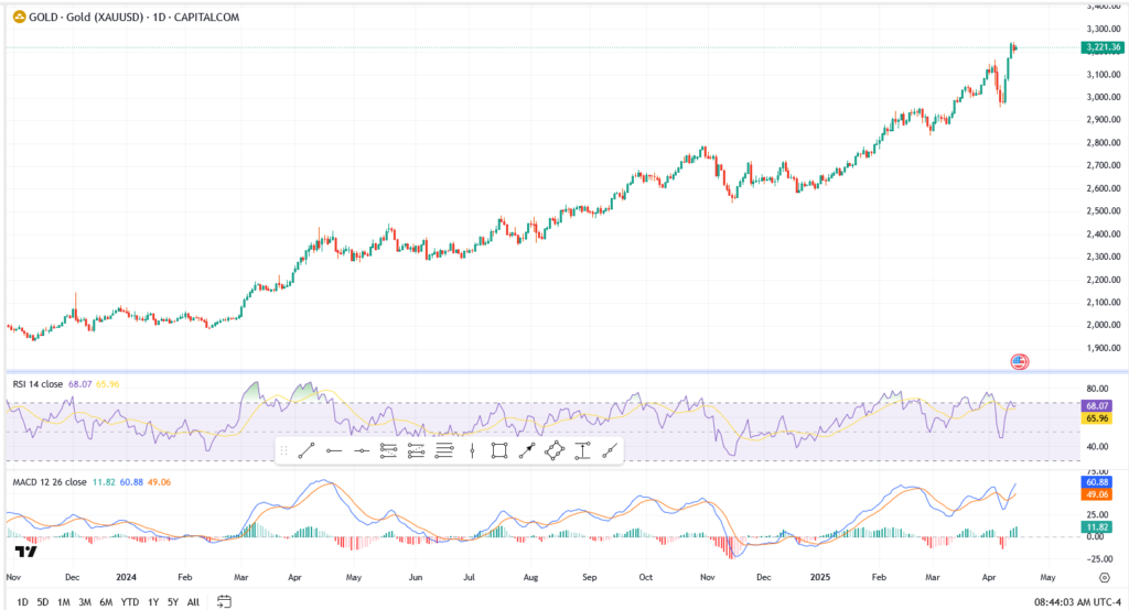 Gold (XAU/USD) exploded to a new all-time high at $3,221.36, capping a jaw-dropping 28% year-to-date surge. With global markets rattled by renewed trade war tensions and rising speculation of aggressive Fed rate cuts, investors are stampeding into safe havens — and gold is clearly leading the charge.