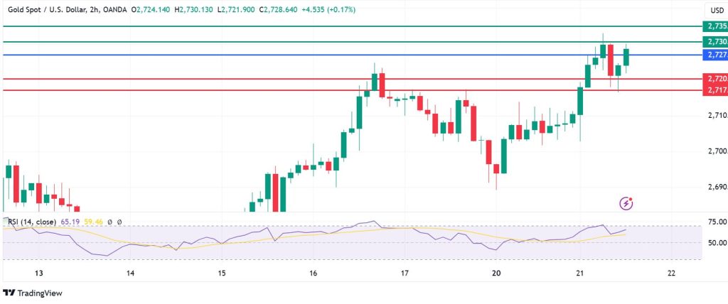 Gold price pivots at $2,720 and the momentum favours the continuation of the upside. With the buyers in control, look for the first resistance at $2,735. Breaching that barrier will clear the path to test the second resistance at $2,740. On the other hand, the momentum will swing to the downside if the price goes below $2,720. That will likely establish the first support at $2,715. Also, breaking below that level will invalidate the upside narrative. However and extended control by the sellers could clear the path to test $2,710.