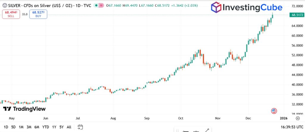 Silver is trading at record levels after extending a strong multi-month rally, supported by safe-haven demand, rate-cut expectations, and a weaker US dollar.
