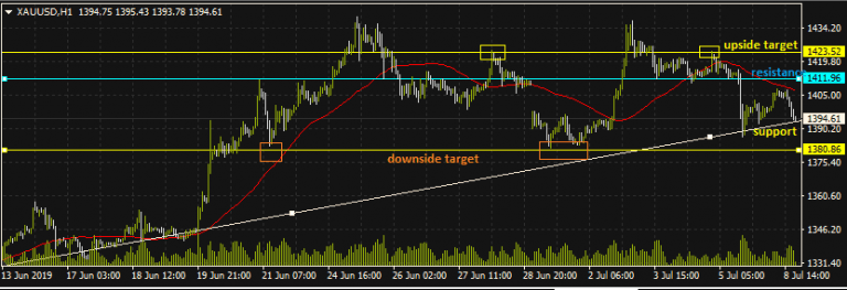 There has to be a sustained break of the ascending trend-line support at the $1,390 – $1,399 price area, confirmed by a double candle close below this support level or a 3% penetration close below the support line, for the door to be open for a move to the next swing low at the $1,380 level. This play would call for a short trade below $1,394 targeting $1,380 with a SL at $1,401.