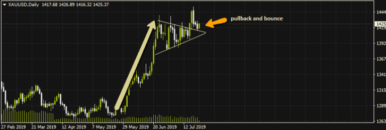 - Gold price is starting move up again after a period of pullback to theh broken bull pennant pattern, as key US data is expected soon.