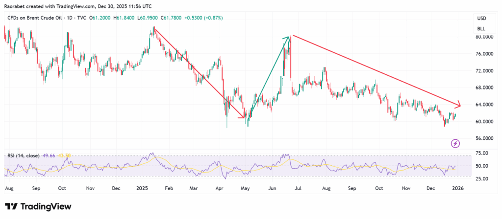 Brent oil price trend in 2025. The commodity spent most of the year on a downward trajectory. Source: TradingView