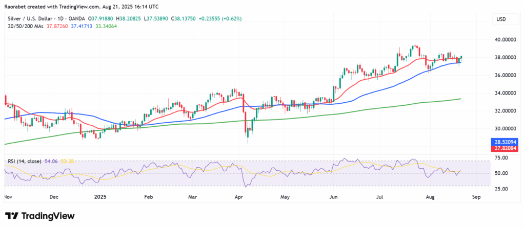As seen on the chart below, silver price is above the 20,50 and 20-day moving average (MA) which are at $37.7,$37.41 and $33.34 respectively as of this writing. Its Relative Strength Index (RSI) is about 54, which is neutral but above 50. This means that the market is still moving but the bullish momentum is relatively slow.