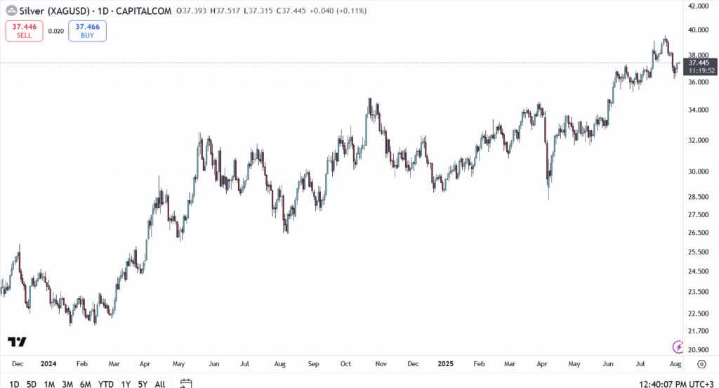 Silver prices are holding firm above $37.40 on Tuesday, extending their bounce from last week’s lows as traders grow more confident that the Federal Reserve could begin cutting rates as early as September. XAG/USD is trading near $37.45, up 0.11% on the day, with safe haven flows and inflation hedging demand lending support.
