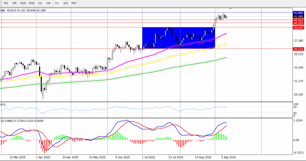 On the daily chart, silver has consolidated above the 50-day moving average since August 4, 2025, and broke above the rectangle shape on the 1st of September, which suggests a bullish continuation and a new uptrend is beginning. Moreover, the MACD signals a bullish momentum.