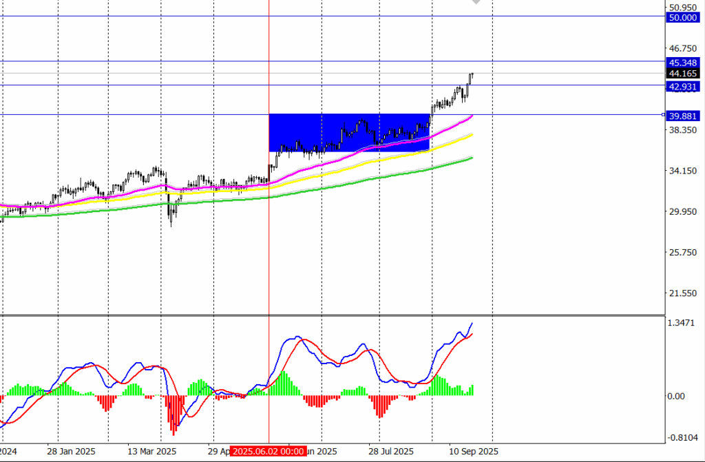 XAG/USD successfully broke above the rectangle pattern at 39.91 at the beginning of September and has since consolidated above this level with steady bullish momentum. This breakout suggests a continuation of the uptrend.
