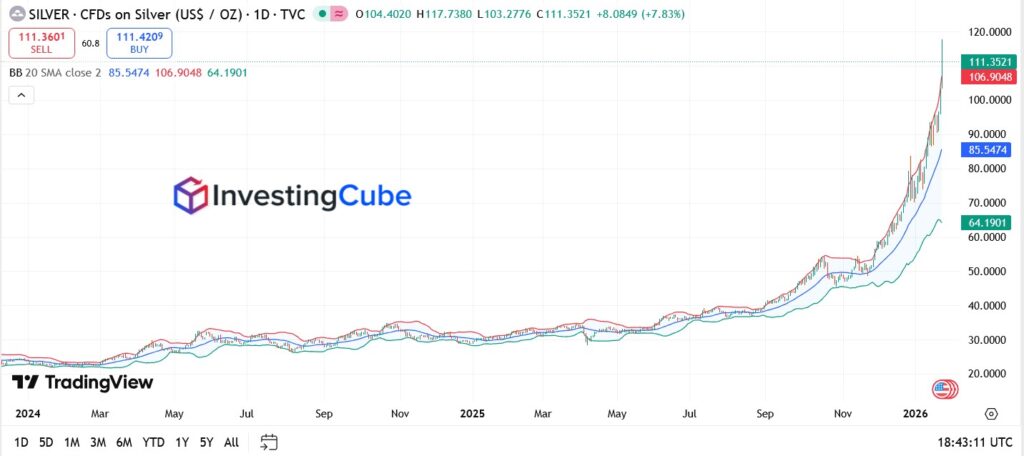 From a technical perspective, silver remains deep in price-discovery mode. On the daily chart, XAG/USD has extended its vertical advance above $110, printing fresh record highs near $117 before settling around $111. Price is holding well above the rising 20-day moving average, with momentum indicators still confirming trend strength rather than exhaustion.