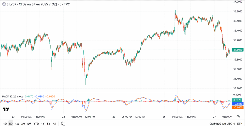 Silver prices are back under pressure, with spot silver (XAG/USD) slipping below $36.00 after an overnight high near $36.85. The move comes on the heels of a risk-on wave in equity markets and a stronger U.S. dollar, both of which clipped the metal’s recent bullish momentum.