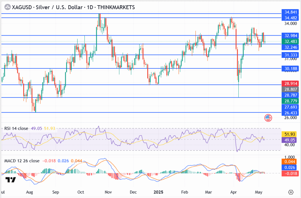 Silver price is on the back foot this morning, slipping below $33.00 as renewed U.S. dollar strength and a cautious risk tone weigh on commodities. As of May 8, 2025, XAG/USD is trading near $32.48, down modestly but threatening to break short-term support. The metal has struggled to hold upside momentum despite recent geopolitical tailwinds and dips in Treasury yields.