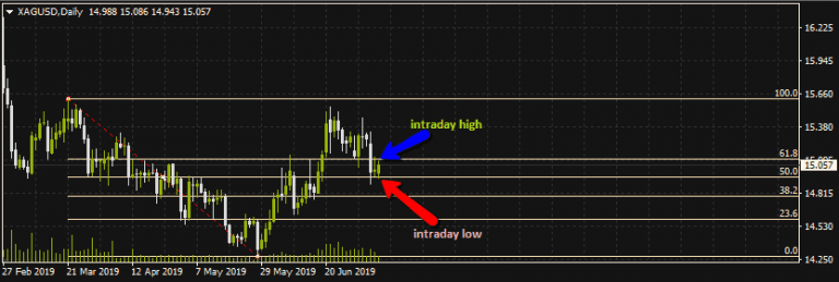 Silver continues to trade sideways for the day in its pairing with the US Dollar. A look at the XAG/USD pairing will show that within the context of the daily pivot points, the intraday range has been between $14.943 to the downside (which is where the S1 pivot point is located) and $15.086 to the upside (close to the R1 pivot). These areas correspond to the 50% and 61% Fibonacci retracement levels drawn on the daily chart from the swing high of March 21 to the swing low of May 29.
