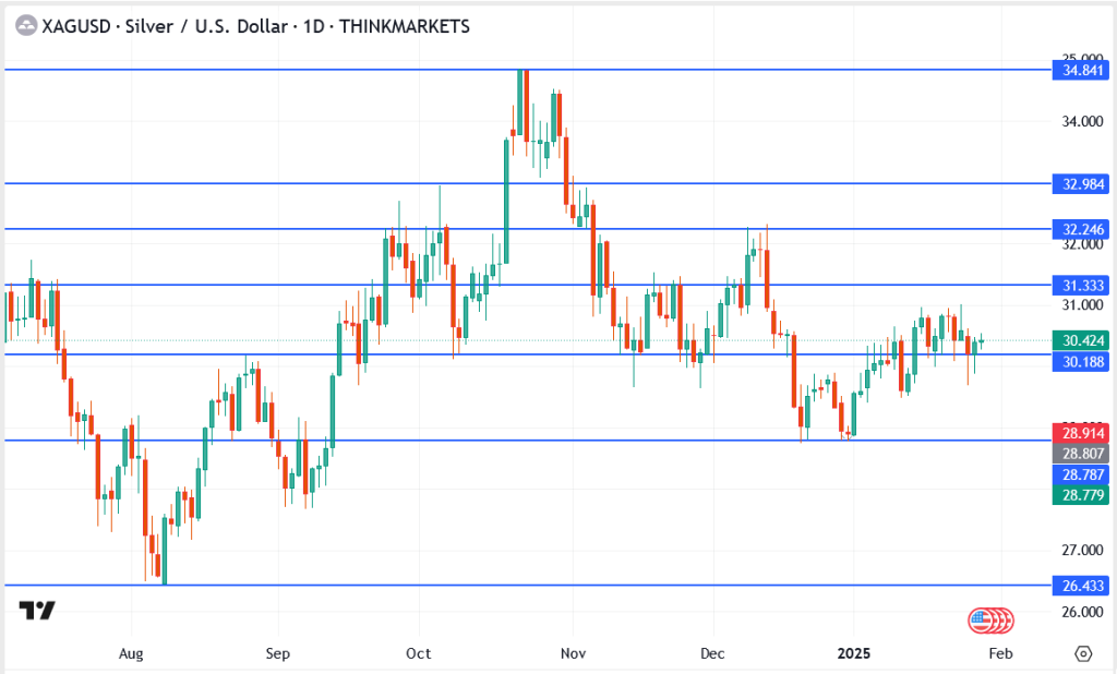 Silver’s daily chart shows a consolidation phase just above key support levels. Bulls must clear $31.33 to extend the rally, while a break below $30.18 could trigger a pullback.