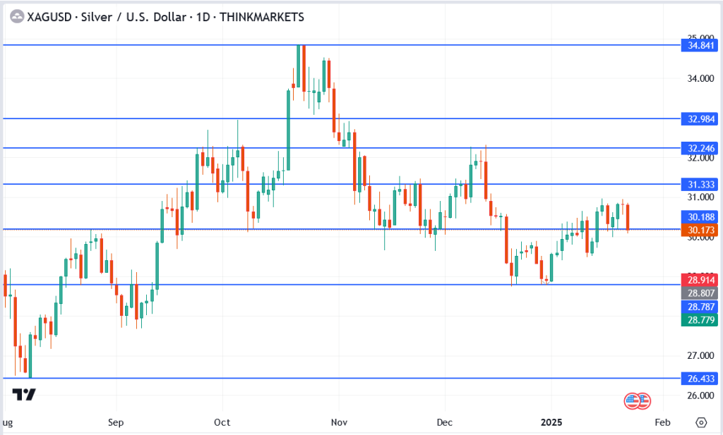 - Range Between $30 and $31: Recent price action suggests silver is consolidating in a tight range, with buyers and sellers closely contesting control around the $30 mark.