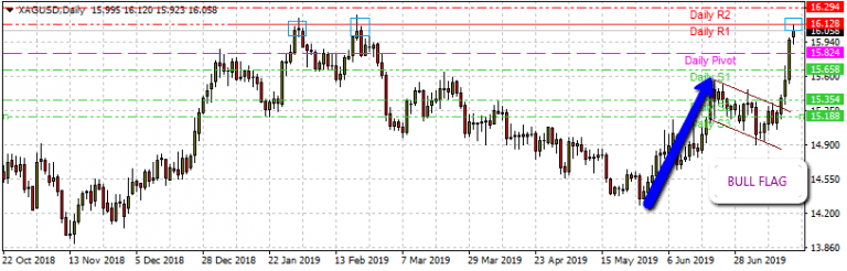 Silver is edging higher today and is currently trading at $16.10, having tested the intraday R1 pivot resistance at $16.20. This resistance is a region where XAGUSD had also registered a double top reversal in January and February 2019. Further tests of this resistance area are expected.