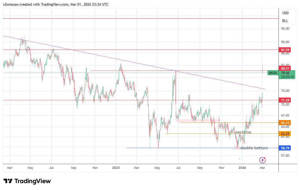 Bull case: the Strait of Hormuz is closed for a while, which could spark a bullish push towards the $80 price mark.