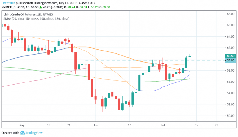 Oil prices are trading higher for one more day amid increasing geopolitical tensions. The American Petroleum Institute reported a crude inventory draw of 8.129 million barrels for the week ending July 4th, compared to market expectations of a 3.081 million barrel draw. Last week, the API reported a draw of 5 million barrels. The net build is just 13.56 million barrels for the 28-week reporting period so far this year.