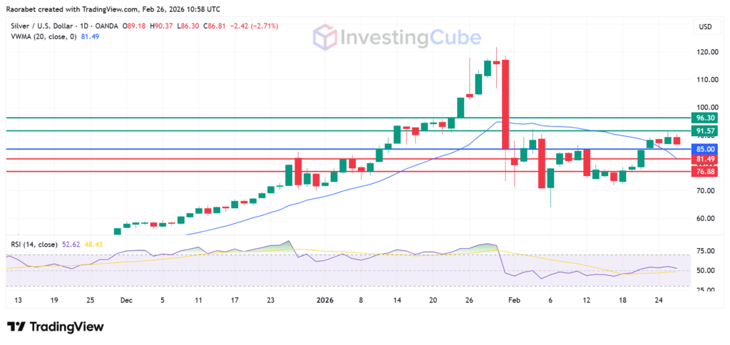 Silver will face its immediate resistance at $91.57, with the second hurdle likely at $96.30. The RSI is close to 53, which means that the upside momentum is steady. The primary support is at the Volume Weighted Moving Average (VWMA) at $81.49, with the second one at $76.88.