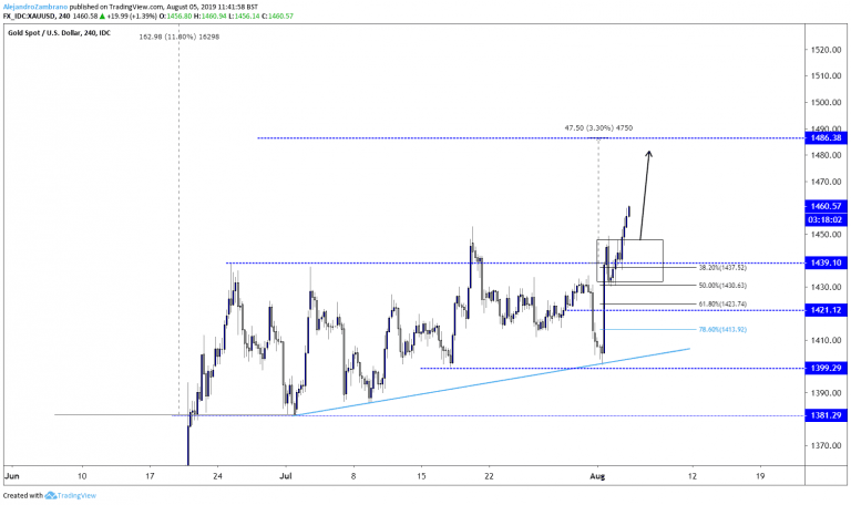 Earlier, today Gold prices (XAUUSD) reached a new 2019 high of $1459.95 as global stock markets plummeted amid the threats of new US tariffs from September 1, and investors searched refuge in the yellow metal.