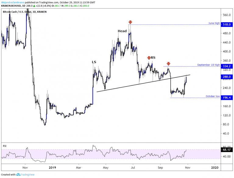 Bitcoin Cash (BCHUSD) is no different, and at the time of writing, the price was trading at $290.9 after failing to take out the neckline of a significant head and shoulder pattern that triggered on September 24. As the price is trading at resistance and up by 47.8% from their October lows, we might see prices consolidate at current level. The price might even trade slightly lower on profit-taking.