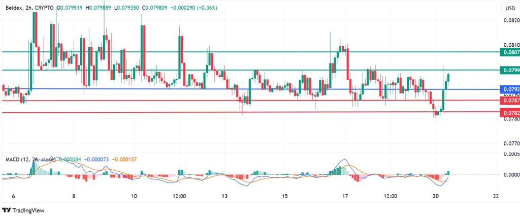 Beldex coin price pivots at $0.0792 and the upside if the asset stays above that level. In that case, immediate resistance is likely to come at $0.0799. However, if the buyers extend their control, it could breach that barrier and test $0.0807.