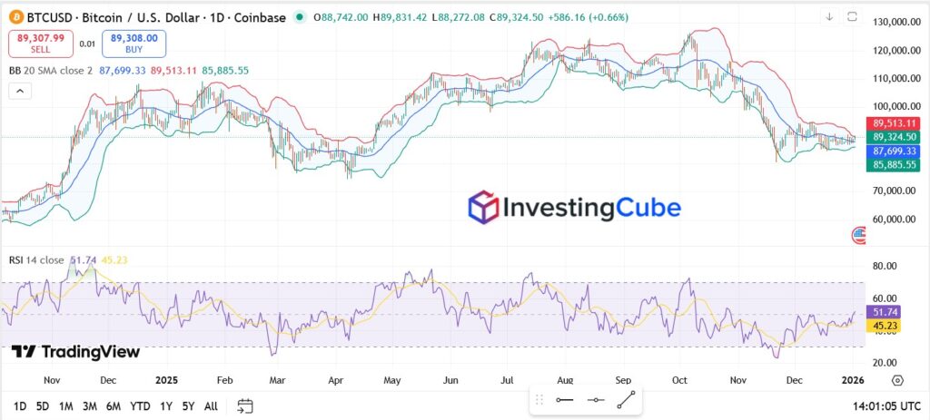 Bitcoin is trading around the mid-$88,000 area as 2026 begins, with the daily chart showing a clear loss of upside momentum following the October peak.
