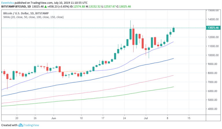Βitcoin (BTCUSD) continues north for one more day adding 3.78 percent at 13,011. Bitcoin capitalization stands above 231 billion while the market capitalization of the top 100 cryptocurrencies also decreased to 355 billion, todays volume is at 26B. Bitcoin (BTC) represents over 57 percent of cryptos value so it is clearly in control of crypto universe at the moment. The recent huge rally that drove prices up to 13,868 attracted the investors attention possibly by the news around Facebook’s Libra new cryptocurrency.