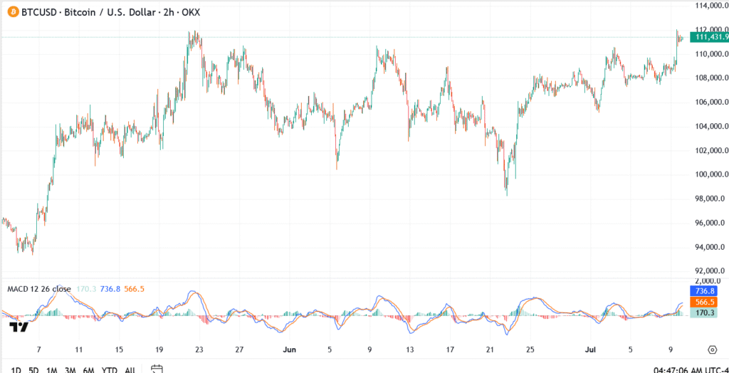 After weeks of trading in a tight consolidation range, BTC/USD has blasted past the psychological $110,000 mark, clocking a new all-time high of $111,431.91 early Thursday. The move confirms yesterday’s rally wasn’t a fluke, it was the ignition of a fresh leg up in what’s becoming a textbook parabolic run.