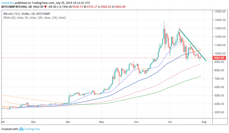 Βitcoin BTCUSD trades below the 10,000 mark for third day in a row giving up 0.71 percent to 9,459. Bitcoin capitalization stands above 169 billion while the market capitalization of the top 100 cryptocurrencies stands above 262 billion, today’s BTC volume is 14B. Bitcoin (BTC) represents over 57 percent of cryptos value so it is clearly in control of cryptomarket universe at the moment. The recent huge rally that drove prices up to 13,868 attracted retail investor’s attention possibly by the news around Facebook’s Libra new cryptocurrency.